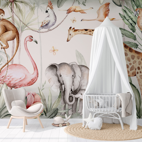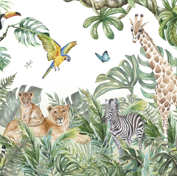 - Produktnummer: 1384031620 Diese Fototapete wurde für ein Kinderzimmer entworfen und zeigt exotische Tiere. Es zeigt u.a. einen Löwen, ein Zebra, eine Giraffe, einen Elefanten und bunte Papageien. Die Tiere sind in einem Dickicht aus exotischen Pflanzen versteckt. Das Ganze ist bunt, aber die verwendeten Farben sind nicht zu intensiv. Dadurch wird das Wandbild nicht übermäßig das Auge des Kindes anziehen.…