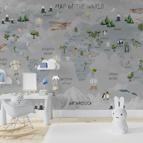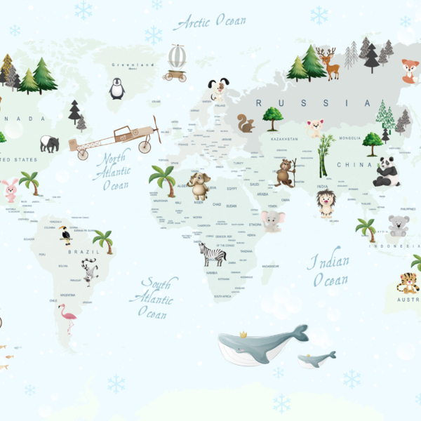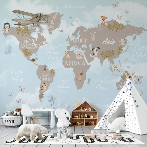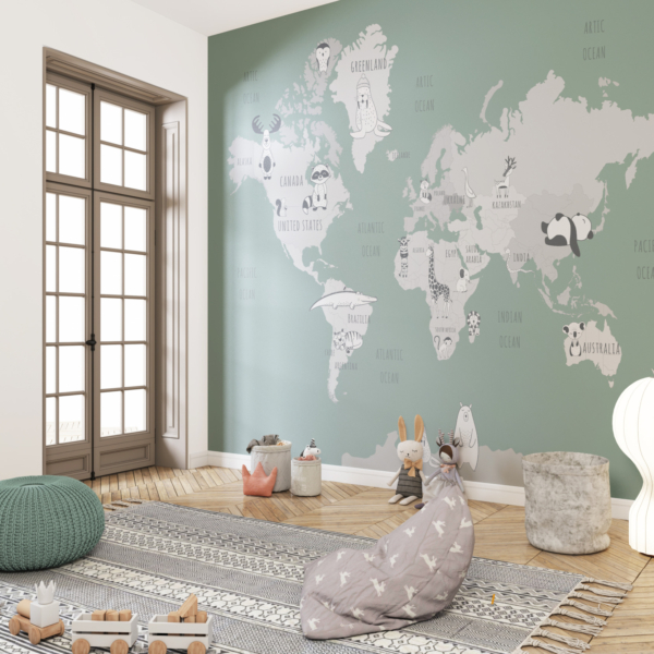 Dacă sunteți în căutarea unor soluții pentru camerele celor mai mici, o pictură murală – o hartă a lumii pentru un copil îmbogățită cu ilustrații de animale caracteristice diferitelor regiuni ale globului – va fi ideală. Acesta este un mod excelent de a combina decorarea cu geografia, deoarece oferă o modalitate interesantă de a învăța despre diversitatea faunei din întreaga lume. Copiii pot învăța despre continente, animale și locuri de pe Pământ, bucurându-se în același timp de o decorațiune unică și colorată în camera lor. Disponibilitatea diferitelor variante de tapet permite clienților să creeze un aranjament unic care să le reflecte pasiunile și stilul de viață.