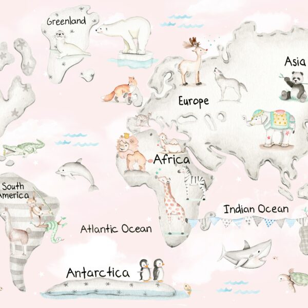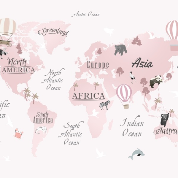 - Dla dzieci, DO DZIECKA, Do pokoju, Dziecięcy, DZIEWCZYNKA, Fototapety, Kolory, MAPA ŚWIATA, Odcienie Brązu i Beżu, Odcienie Różowego, Styl, ZWIERZĘTA