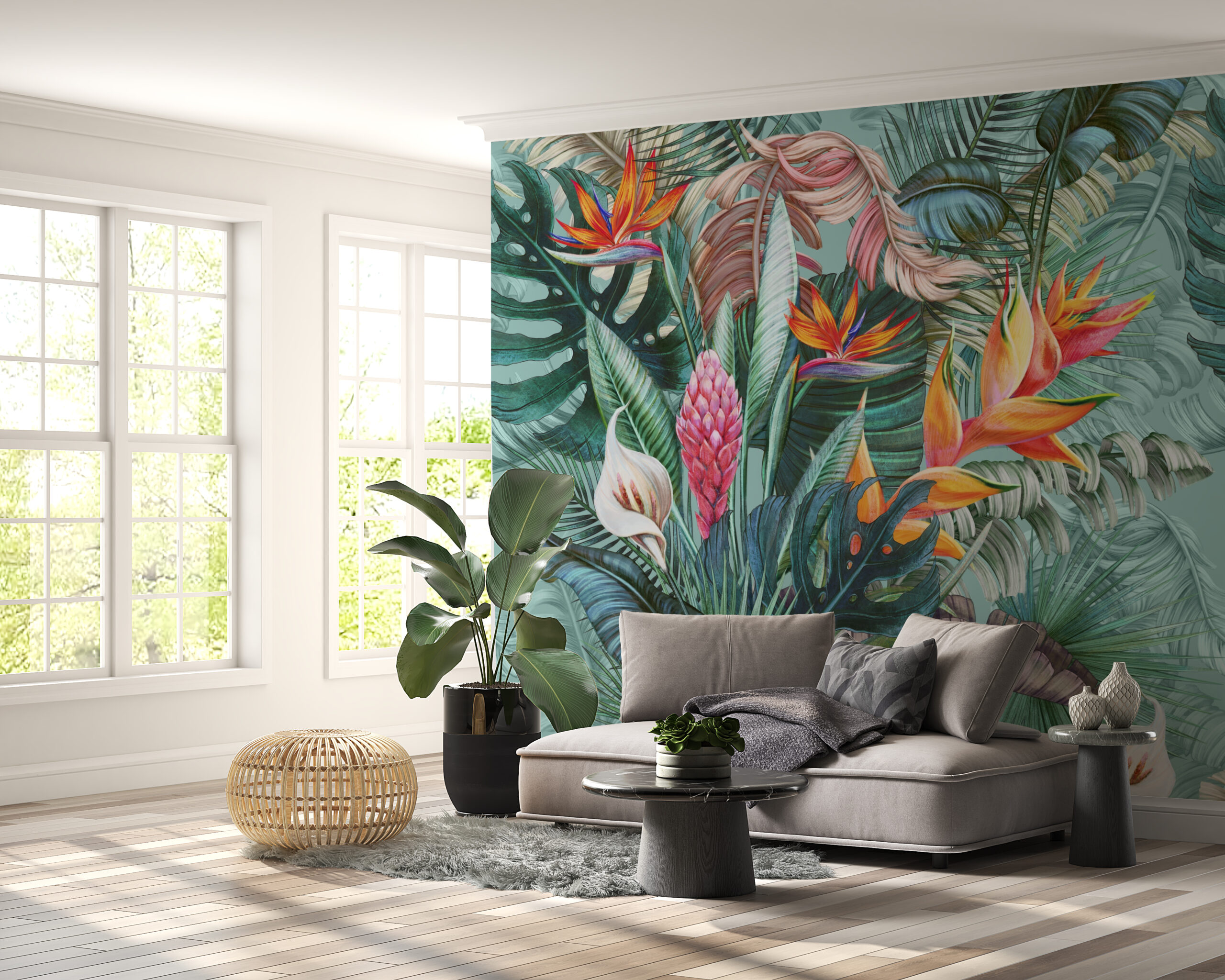 Căutați ceva care să vă înveselească interiorul și să facă din fiecare privire o plăcere pură? Dacă da, pictura murală „Buchet de flori tropicale” este soluția perfectă pentru tine!