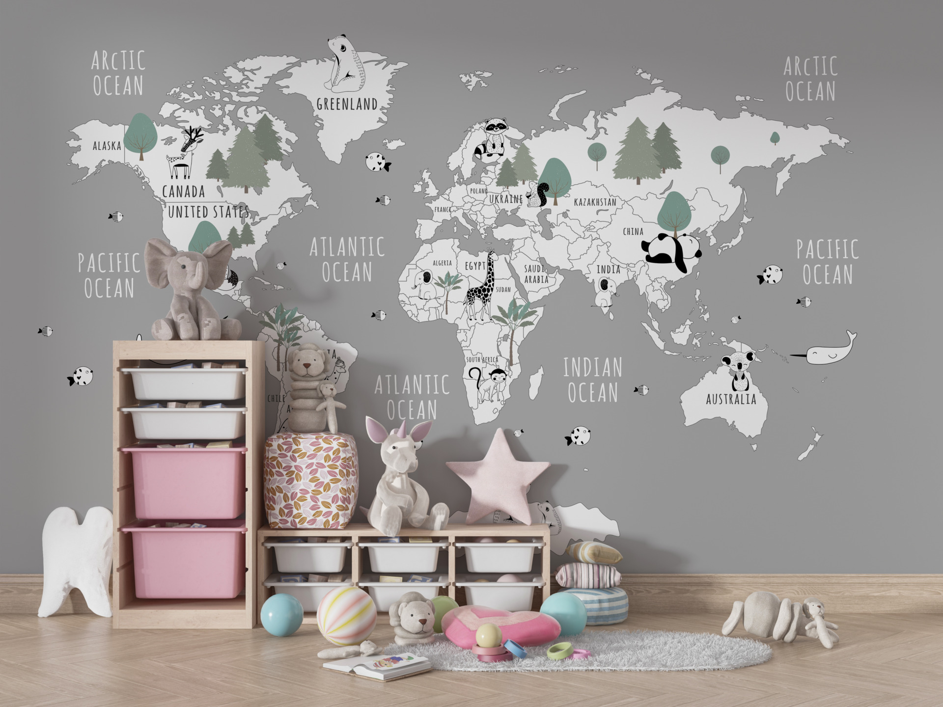 Oferiți o atmosferă unică în interiorul dvs. cu imaginea de fundal foto „Copaci pe harta lumii”. Comandați acum!