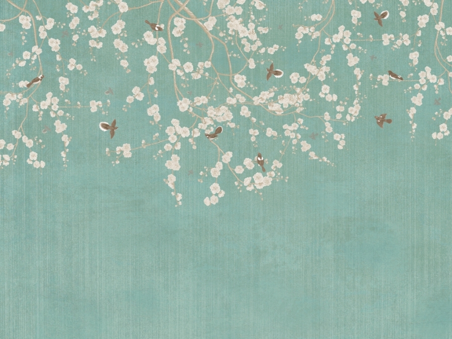 Transportați-vă într-o grădină magică plină de petale de flori cu această frumoasă pictură murală. Plantele înflorite în alb pe un fundal albastru moale vor adăuga confort și prospețime în orice cameră.