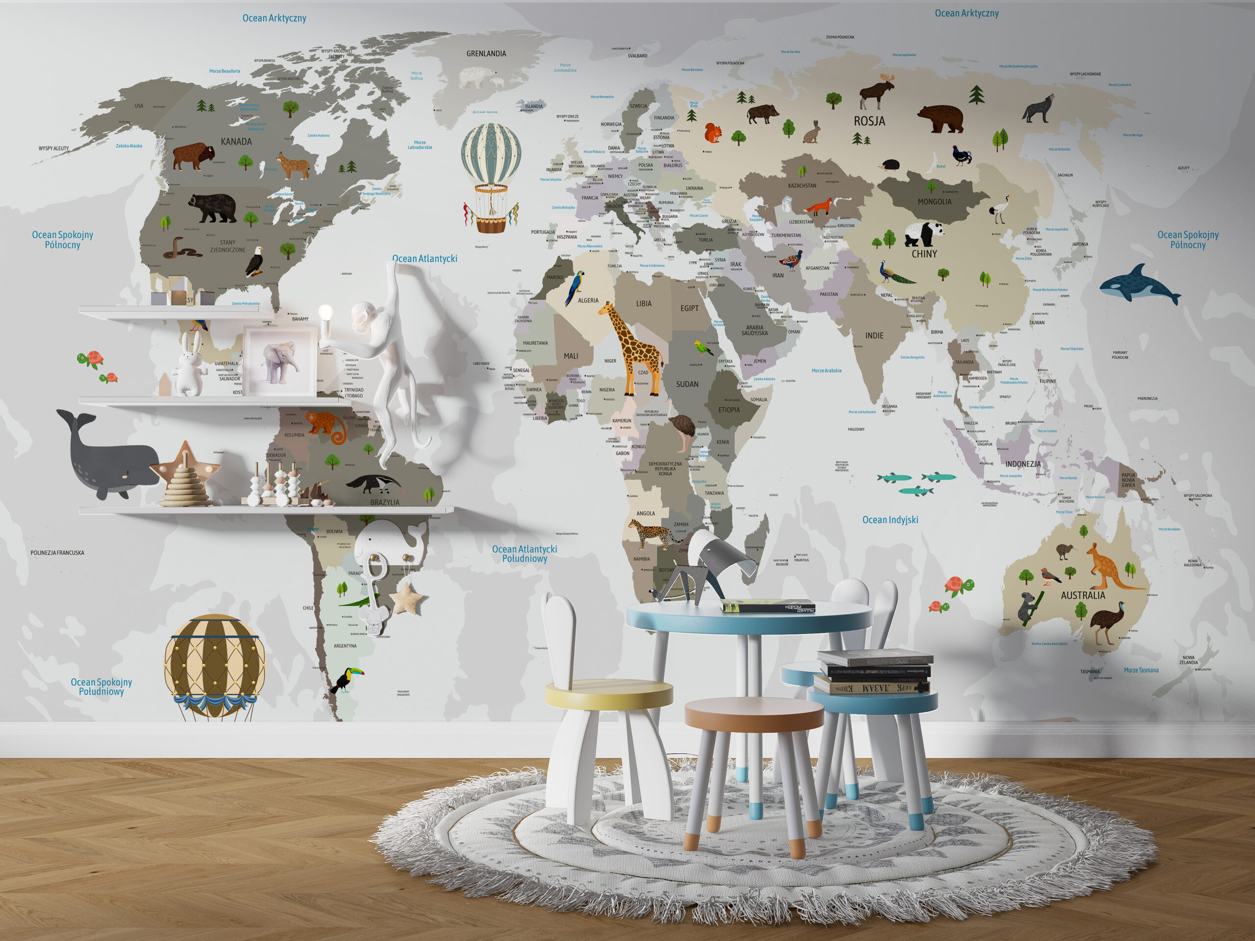 Die Weltkarte in Polnisch auf der Fototapete ist nicht nur eine Dekoration für Ihren Raum, sondern kann auch ein großartiges Lernmittel für Kinder oder Jugendliche sein. Sie ermöglicht es ihnen, sich mit den Namen von Ländern, Hauptstädten und geografischen Orten auf der Weltkarte vertraut zu machen.