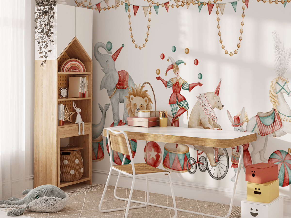 Zamień pokój dziecka w niezwykłą arenę pełną śmiechu i przygód dzięki fototapecie „Cyrk Zwierzęcych Talentów”. Ta urocza ilustracja w pastelowych barwach przedstawia cyrkowe zwierzęta w zabawnych rolach – od tańczących fok i jeżdżących na rowerze misiów po eleganckiego lwa przeskakującego przez obręcz. Towarzyszy im wesoły klaun i radosna parada postaci, które przeniosą malucha do świata cyrkowych czarów.