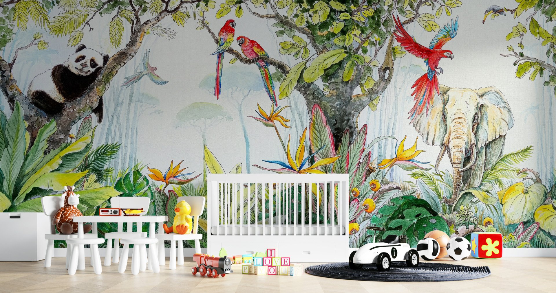 Na tej fototapecie znajduje się dynamiczna scena z czerwonymi papugami, które przemierzają gęstą dżunglę pełną egzotycznych roślin i kwiatów. Kolory są pełne życia i energetyczne, co sprawia, że pomieszczenie nabiera nowego życia i charakteru.