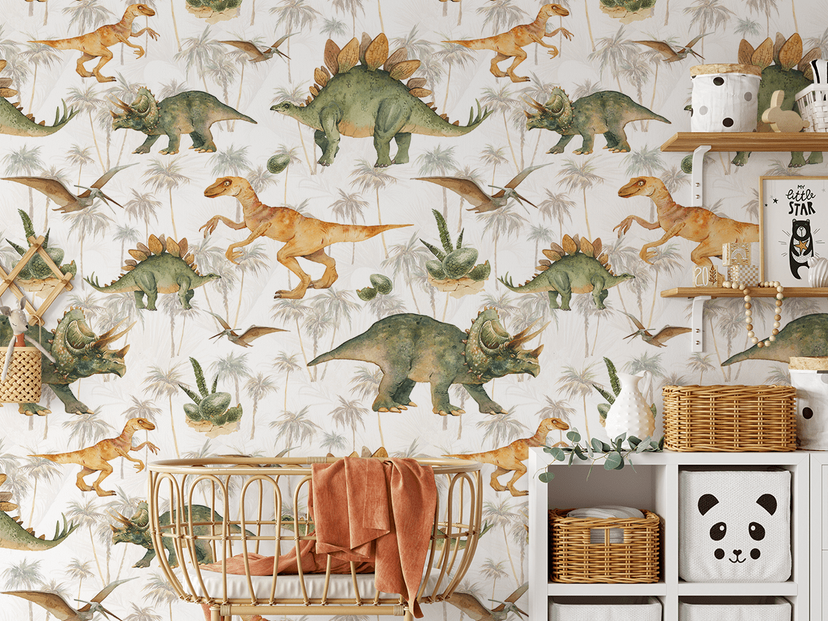 Idealna do pokoju dziecięcego, przedszkola czy bawialni, fototapeta doda wnętrzu energii i kreatywności, wspierając rozwój wyobraźni najmłodszych. Dzięki niej każde dziecko poczuje się jak mały odkrywca wśród pradawnych stworzeń.