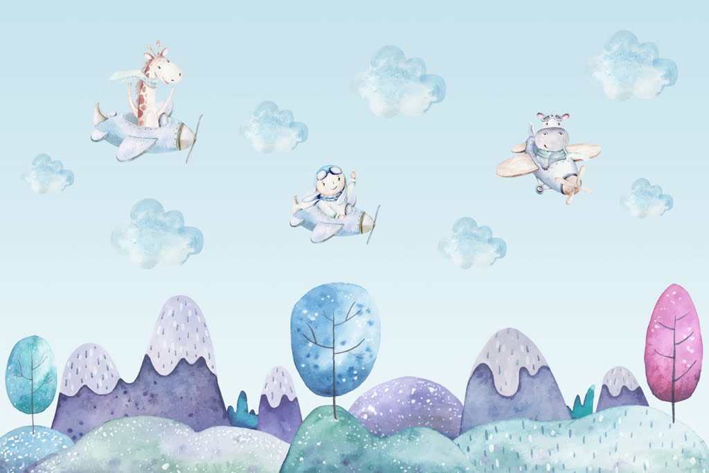 Zaprojektowana z myślą o dzieciach zabawna fototapeta, która świetnie ożywi każdy dziecięcy pokój. Nad górami o nieco śmiesznym kształcie latają samoloty z niecodziennymi pasażerami. Wśród nich znajduje się między innymi żyrafa oraz krówka. Fototapeta