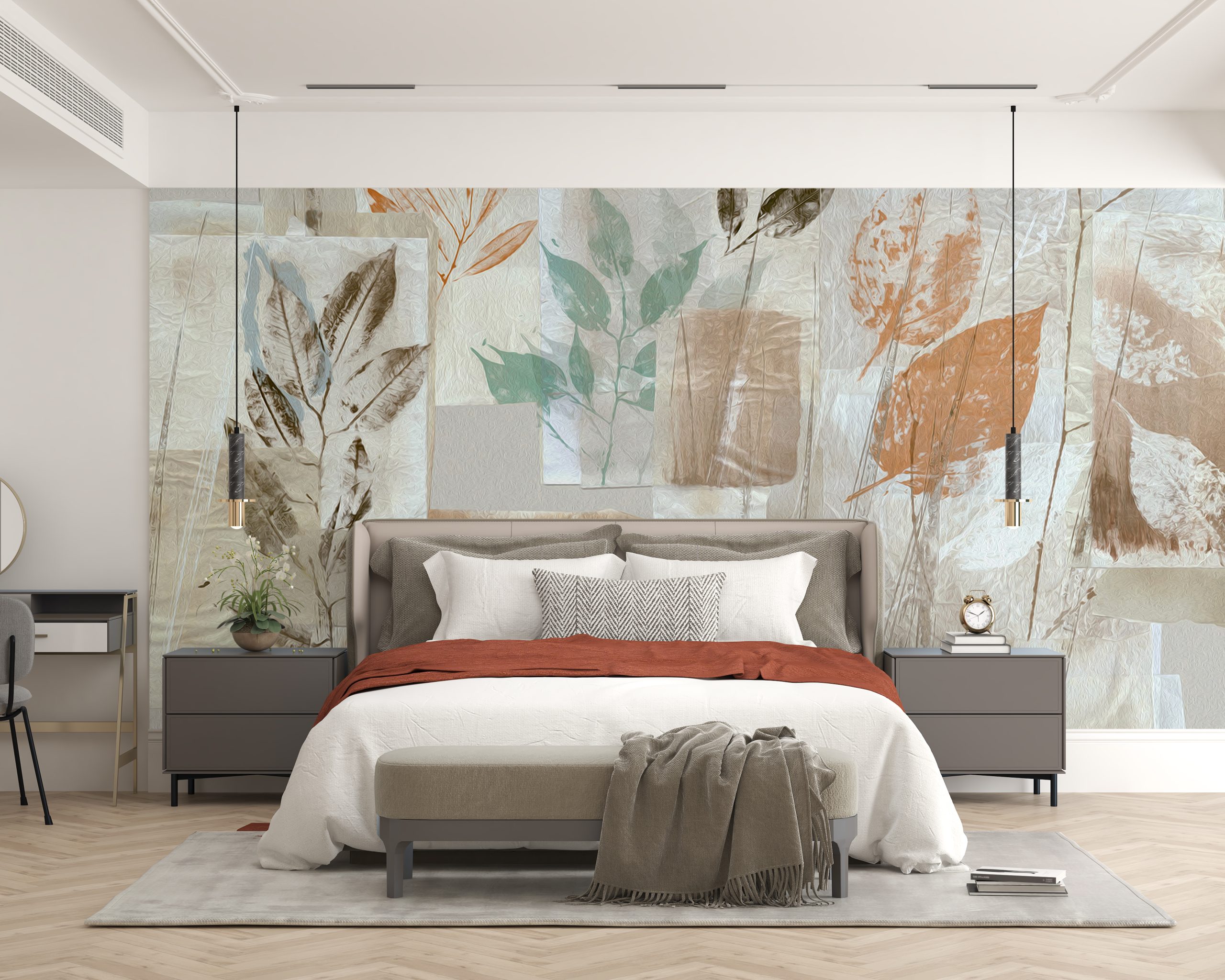 Na tej fototapecie możesz zobaczyć geometryczne kształty prostokątów przeplatane delikatnymi liśćmi, które nadają całości delikatności i naturalnego uroku. Dzięki stonowanej kolorystyce w odcieniach zieleni i szarości, fototapeta doskonale wpasuje się zarówno do nowoczesnych, jak i tradycyjnych wnętrz.
