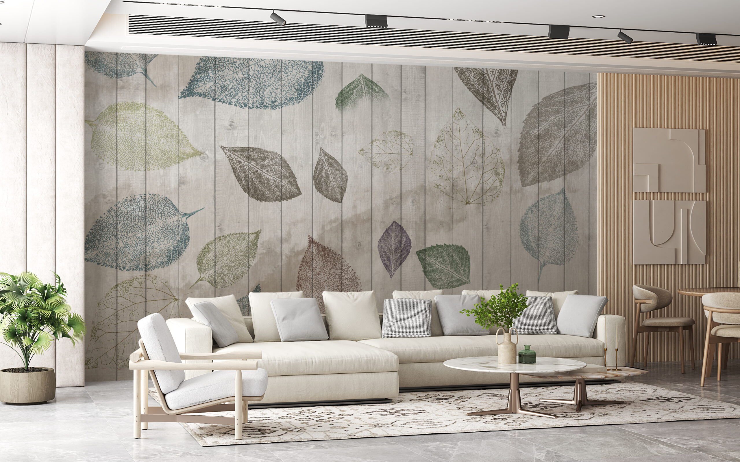 Ta piękna fototapeta przedstawia realistyczne liście na deskach, co sprawia, że wnętrze nabiera naturalnego uroku i świeżości. Idealna do salonu, sypialni czy biura, nadając pomieszczeniu oryginalny charakter.