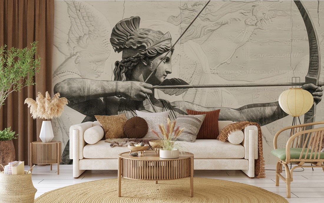Każdy detal tej fototapety – od realistycznie oddanych fałd szaty, przez klasyczny hełm, aż po precyzyjnie wykreśloną linię napiętego cięciwa – został starannie zaprojektowany, aby oddać ducha antycznej sztuki w nowoczesnej formie. Monochromatyczna kolorystyka – w eleganckich odcieniach czerni, bieli i szarości – dodaje całości ponadczasowej klasy, jednocześnie podkreślając kontrasty i głębię kompozycji.