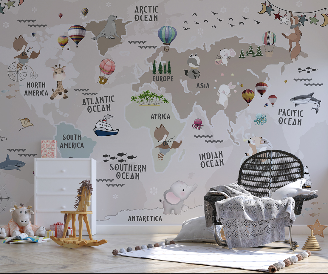 Przekształć pokój dziecka w edukacyjną przestrzeń z fototapetą **Mapa Świata ze Zwierzątkami**! Kolorowa mapa świata z uroczymi zwierzątkami to doskonały sposób na połączenie nauki i zabawy. Wysoka jakość druku i łatwy montaż gwarantują, że tapeta będzie wyjątkową ozdobą