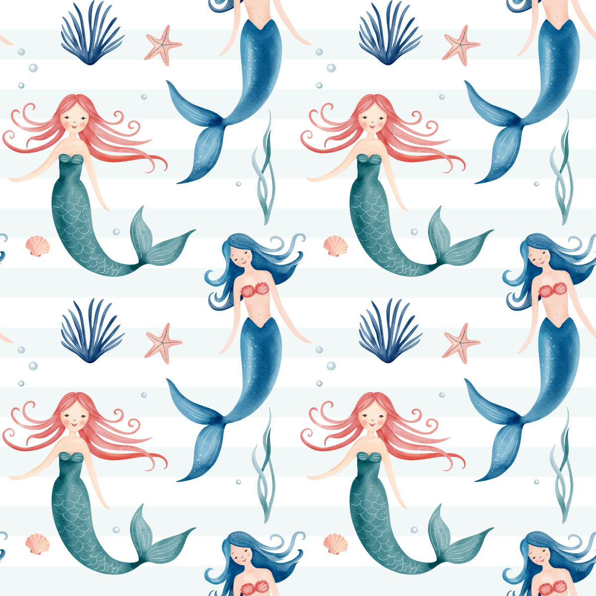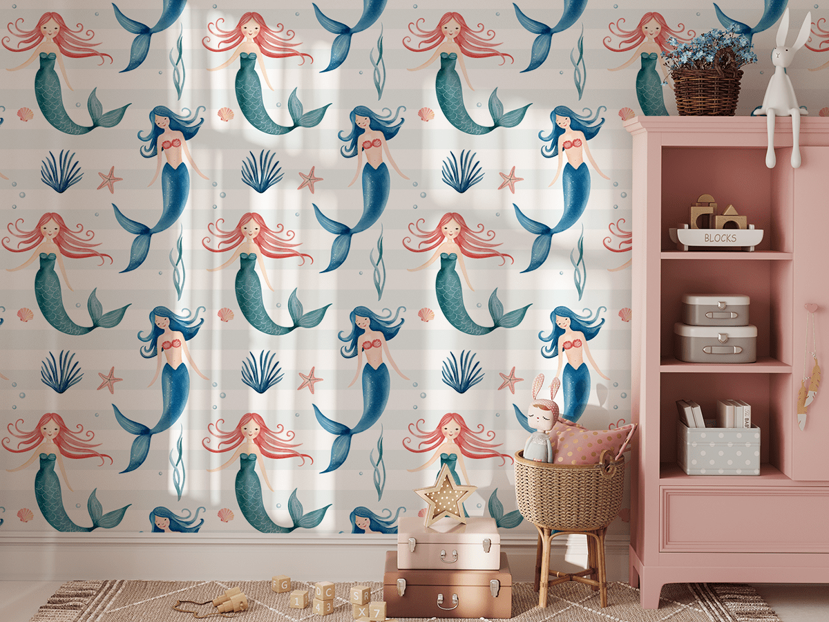 Zamień pokój Twojego dziecka w zaczarowaną podwodną krainę dzięki fototapecie „Morskie Księżniczki”. Uroczy wzór z syrenkami o barwnych ogonach, muszelkami i morskimi roślinami przenosi maluchy prosto do świata wyobraźni, gdzie magia miesza się z wodnym światem przygód.