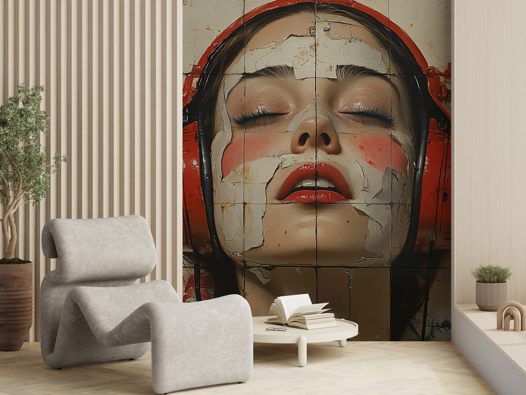 Fototapeta „Muzyczne mozaikowe marzenie” to wyjątkowe połączenie sztuki portretu z nowoczesną formą mozaiki. Centralnym motywem jest kobieca twarz w słuchawkach — skupiona, jakby zatopiona w dźwiękach, wprowadzająca w intymny, pełen emocji świat muzyki. Kompozycja została podzielona na równomierne kwadraty, które tworzą efekt artystycznej mozaiki, przypominającej kolaż fragmentów dźwięków, wspomnień i emocji.