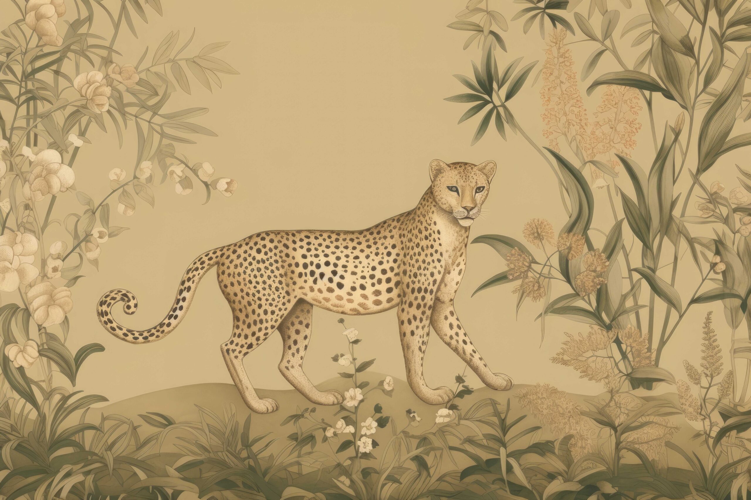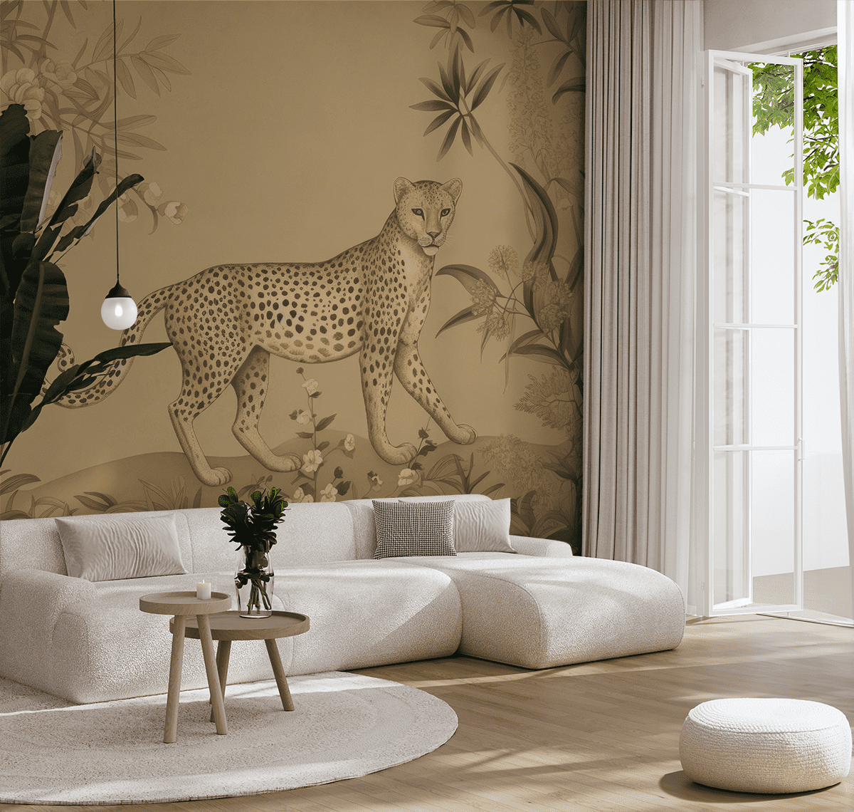 Wprowadź do swojego wnętrza nutę egzotyki i wyrafinowania dzięki fototapecie „Ogród Geparda”. Ten artystyczny wzór łączy w sobie majestatyczną sylwetkę geparda z subtelną, botaniczną kompozycją roślin, tworząc dekorację pełną spokoju, równowagi i naturalnego piękna. Ciepła paleta beżów i zgaszonych zieleni doskonale współgra z klasycznymi oraz nowoczesnymi aranżacjami.