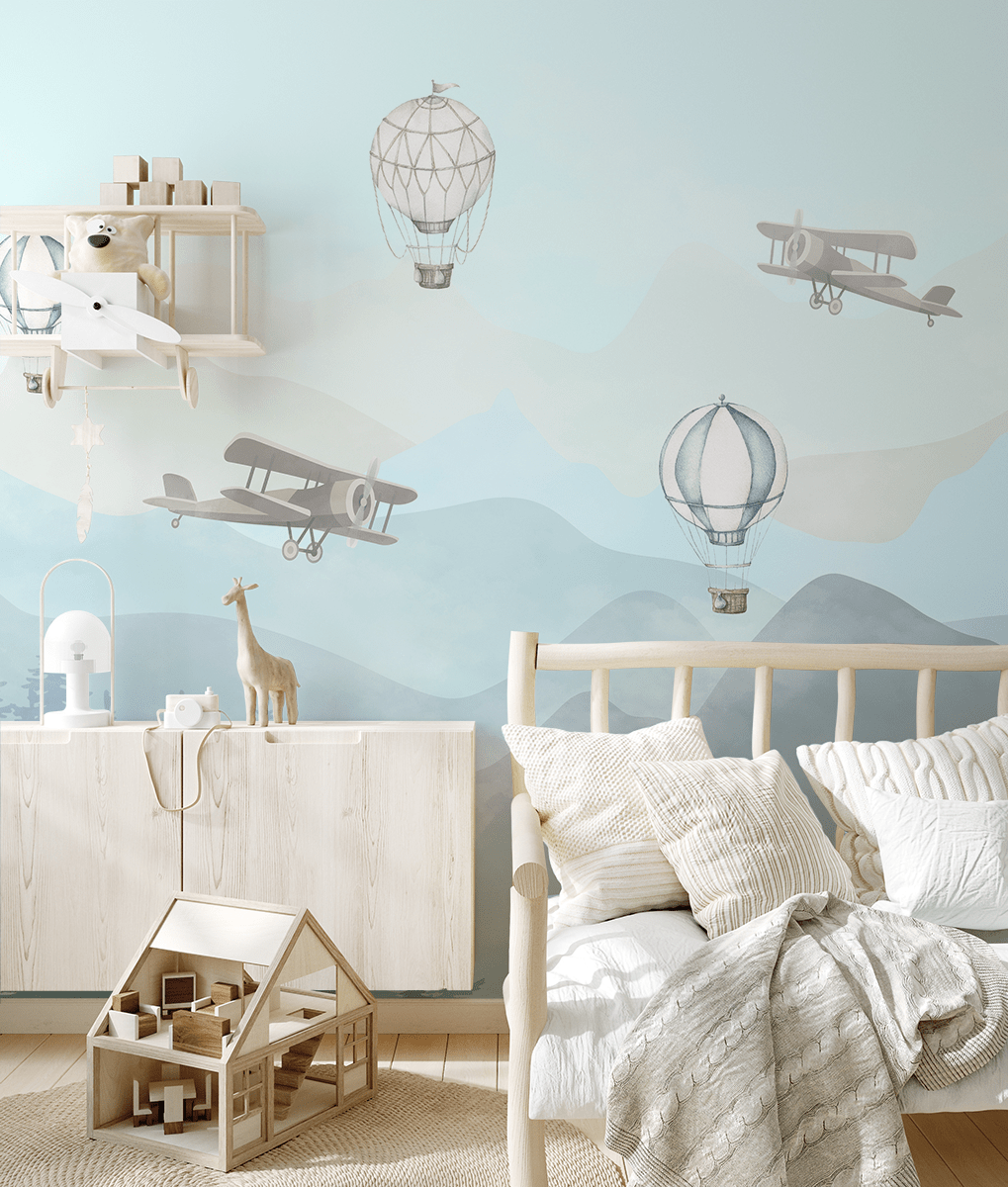 Fototapeta „Podniebna Wędrówka” – magiczna podróż w świat latających balonów i starych samolotów dla małych odkrywców