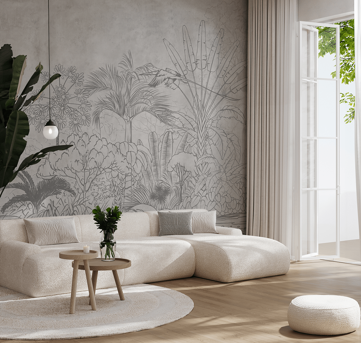 Każdy element tej grafiki oddaje ducha epoki, w której natura dominowała bez ingerencji człowieka. Ten „szkic sprzed czasu” zachwyca nie tylko jakością wykonania, ale także wyjątkową atmosferą – surową, ale spokojną, tajemniczą, ale bliską. Dzięki ograniczonej kolorystyce i bogactwu detali fototapeta wprowadza do wnętrza wyjątkową równowagę pomiędzy sztuką a naturą.