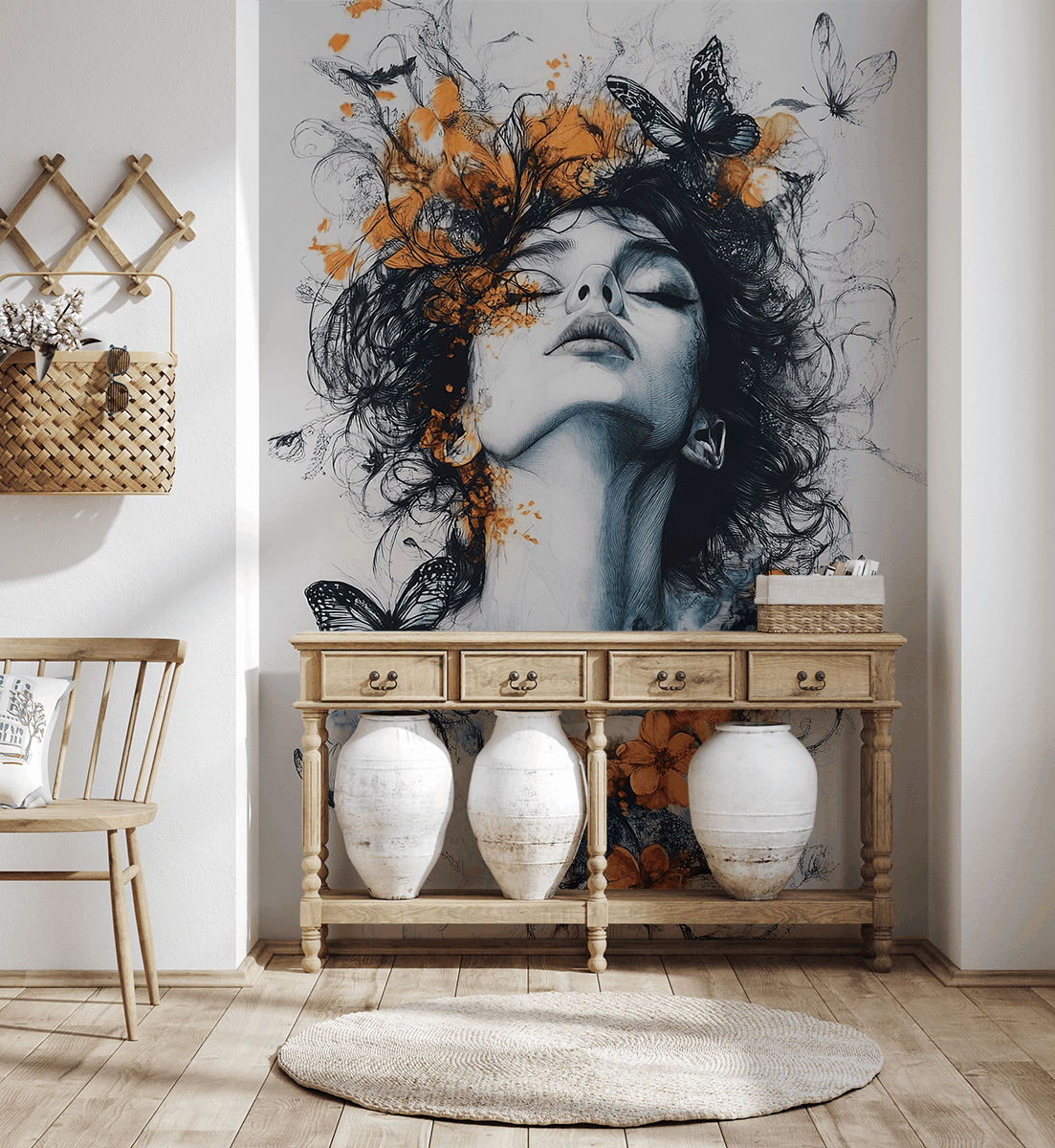 Wprowadź do swojego wnętrza wyjątkową atmosferę dzięki fototapecie. Ten poruszający artystyczny portret kobiety, otoczonej motylami i kwiatami, łączy dynamiczny szkic z plamami koloru, tworząc kompozycję pełną emocji, ruchu i lekkości. Zestawienie kontrastujących barw – czerni, pomarańczy i błękitu – nadaje przestrzeni wyrazistości i głębi.