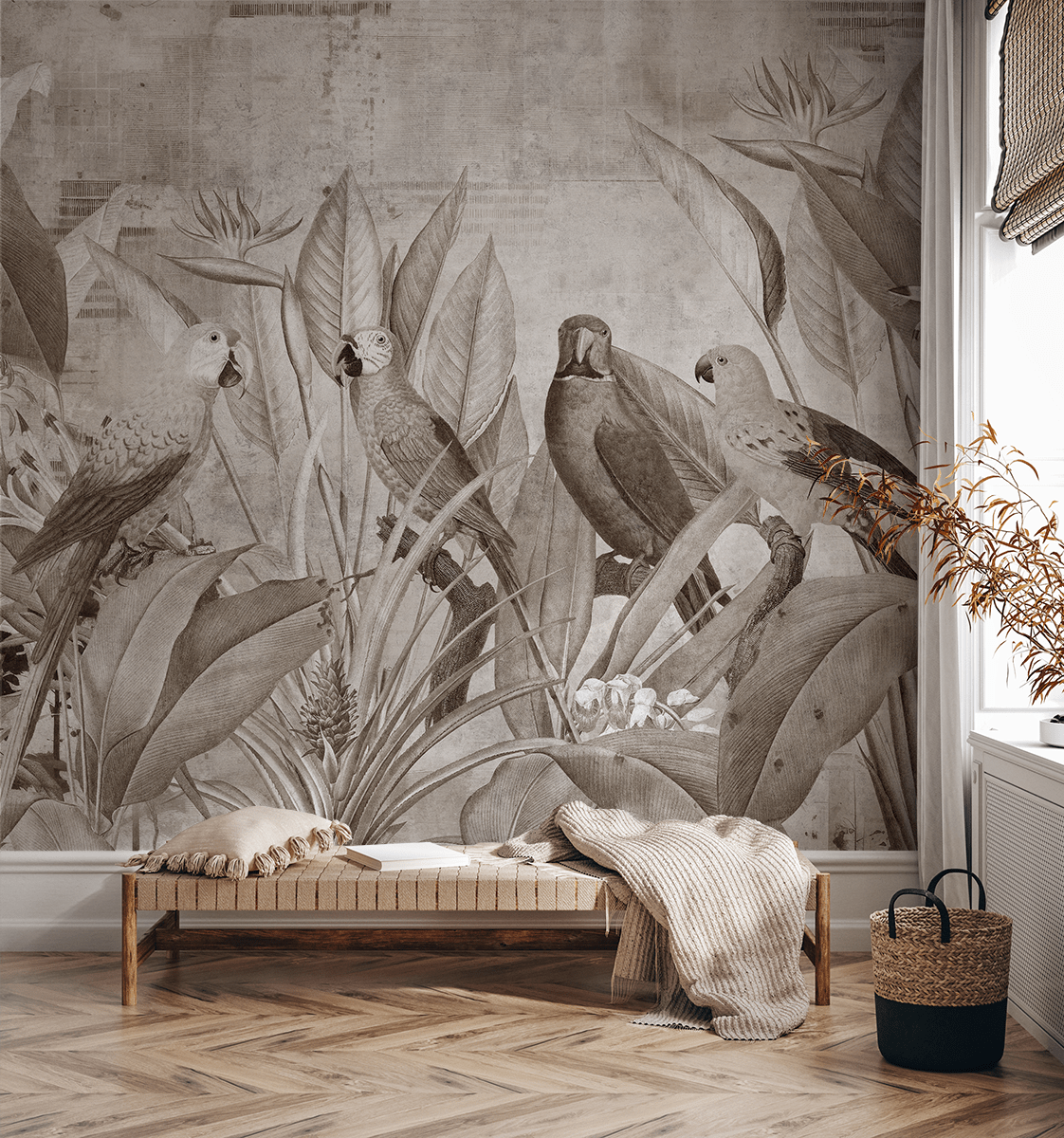 Wprowadź do swojego domu wyjątkowy klimat dzięki fototapecie „Rajskie Spotkanie”. Ten kunsztowny, sepia-tonowany motyw papug otoczonych bujną, tropikalną roślinnością przywołuje atmosferę egzotycznej dżungli, dodając przestrzeni ciepła i naturalnej elegancji. Precyzyjne detale ptaków oraz liści idealnie wpisują się zarówno w klasyczne, jak i nowoczesne aranżacje wnętrz.