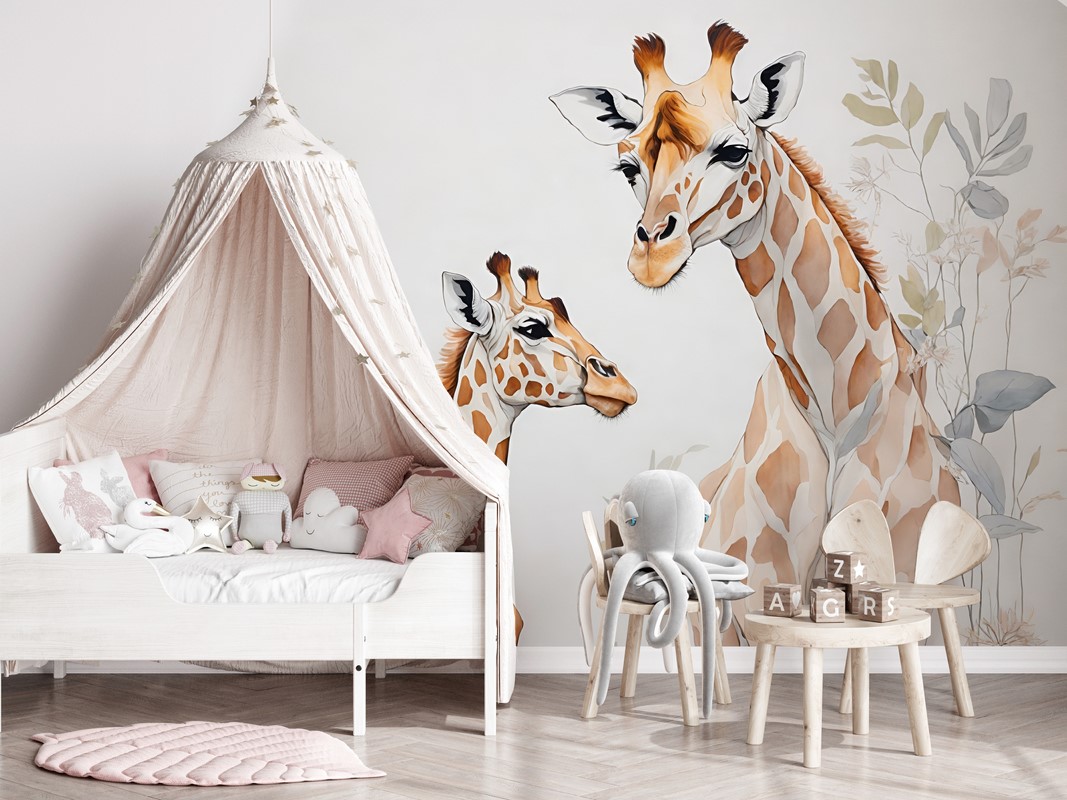 Fototapeta „Rodzina żyraf” to ciepły i pełen uroku motyw idealny do pokoju dziecięcego. Przedstawia rodzinną scenę z żyrafami w spokojnej, naturalnej scenerii. Styl ilustracji jest łagodny, pastelowy i przyjazny dla oka, co sprzyja tworzeniu przytulnej i harmonijnej przestrzeni dla najmłodszych. Wzór emanuje pogodą ducha i jest często wybierany jako element wystroju wnętrz w stylu skandynawskim, boho-kids lub sielskim dziecięcym.