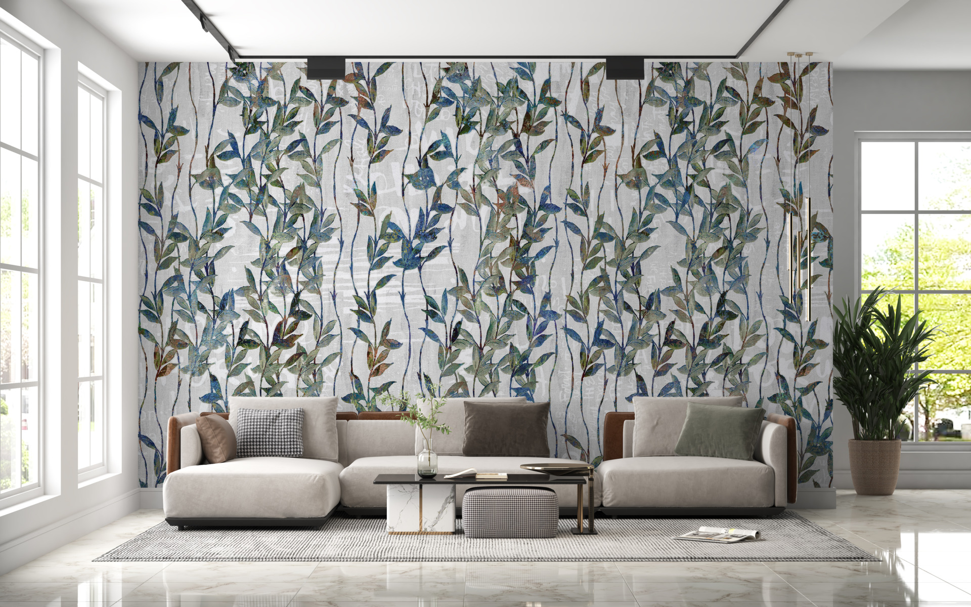 Ta wysokiej jakości fototapeta przedstawia różnorodne rośliny w delikatnym, tkaninowym wydaniu, co sprawia, że pomieszczenie nabiera