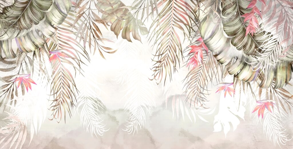 Tato okouzlující nástěnná malba obsahuje jemné růžové listy na decentním pozadí. Tento vzor dodává interiéru svěžest a lehkost a místnost působí útulně a přirozeně.
