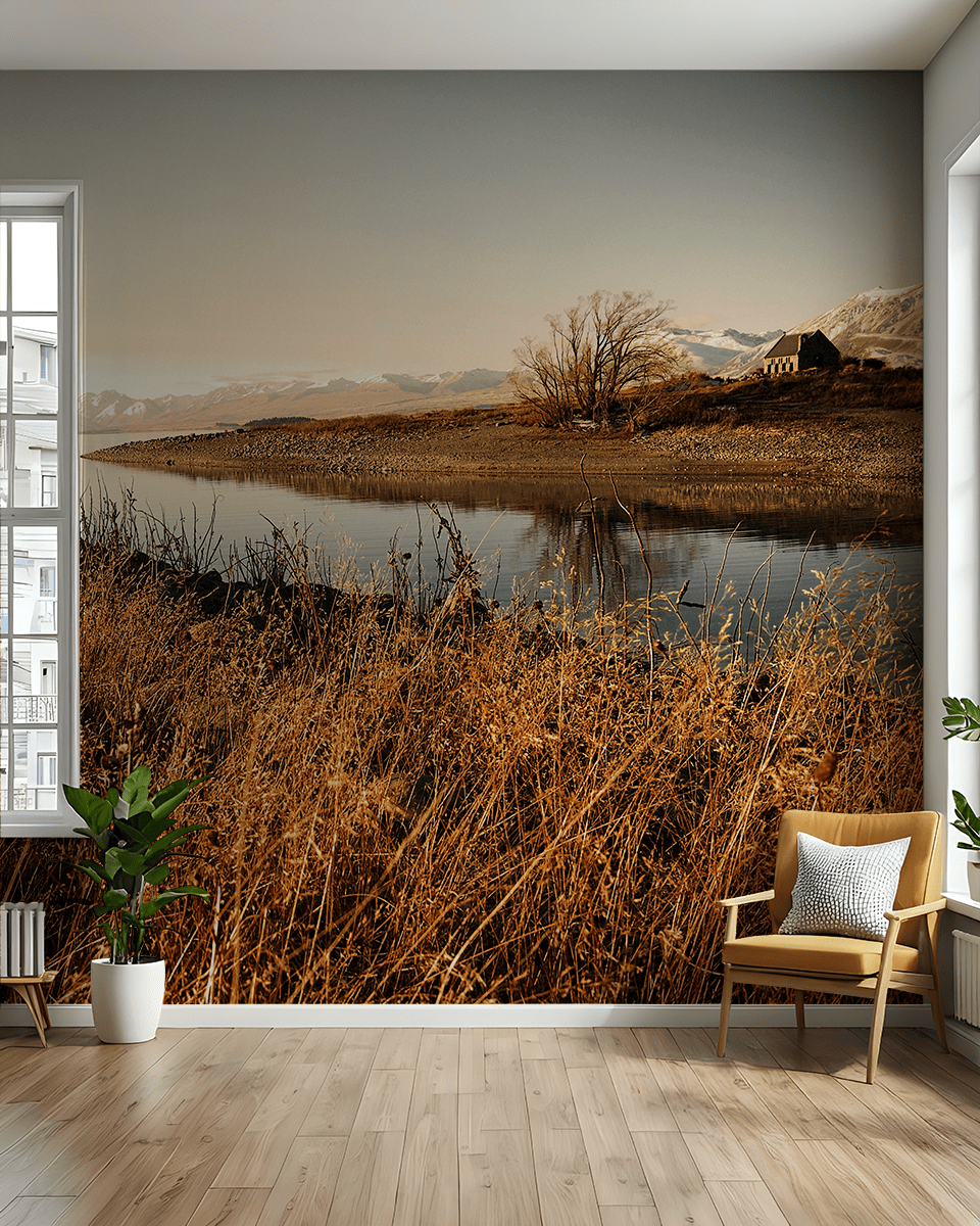 Wprowadź do swojego domu unikalny spokój dzięki fototapecie „Spokój Jeziora”. Ten malowniczy widok, przedstawiający spokojną wodę jeziora otoczoną złocistymi trawami i majestatycznymi górami, wprowadza do przestrzeni atmosferę ciszy i relaksu. Delikatne odcienie złota i błękitu oraz subtelne odbicie w wodzie tworzą idealne tło dla każdego wnętrza, nadając mu wyjątkowy, naturalny charakter.