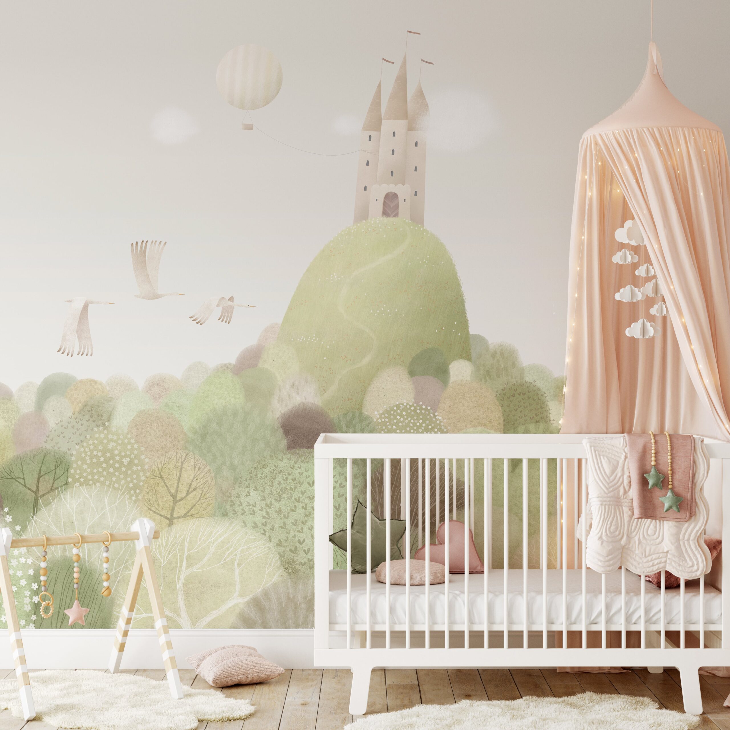 Wprowadź do pokoju swojego dziecka wyjątkowy klimat dzięki fototapecie „Zaczarowany Gaj”. Ta delikatna i pastelowa scena przedstawia zaczarowany las z zamkiem na wzgórzu, unoszącym się balonem oraz leśnymi ptakami, które zapraszają do wspólnej wyprawy pełnej wyobraźni i radości. Subtelne kolory i miękkie kształty tworzą przyjazną i spokojną atmosferę, idealną dla dziecięcych marzeń i zabaw.