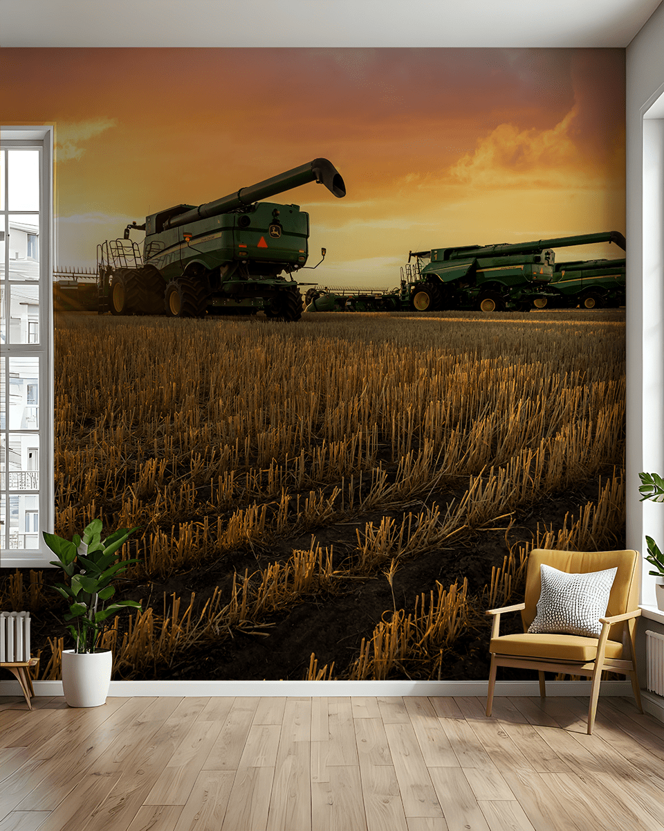 Wprowadź do swojego wnętrza magię późnego lata dzięki fototapecie „Złote Żniwa”. Ten pełen światła, naturalny krajobraz ukazujący kombajny na tle zachodzącego słońca oddaje esencję pracy na roli i piękna polskiej wsi. Ciepłe barwy, dynamiczna perspektywa i złociste pola tworzą atmosferę spokoju, pracy i wdzięczności wobec natury.