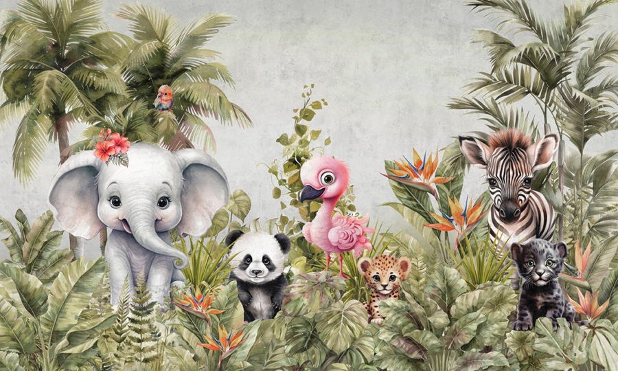 Vneste do dětského pokoje atmosféru exotického dobrodružství s fototapetou „Zvířata v džungli“. Tento barevný motiv zobrazuje různá zvířata v jejich přirozeném tropickém prostředí, což podněcuje zvědavost a vybízí k poznávání světa přírody.