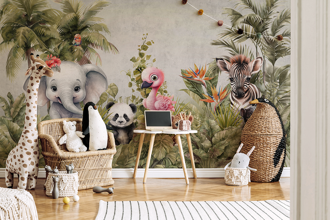 Fototapeta „Zvířátka v džungli“ se hodí nejen do dětského pokoje, ale také do dětského pokoje nebo na hřiště, kde vnese prvek přírody a radosti do každodenního prostředí.