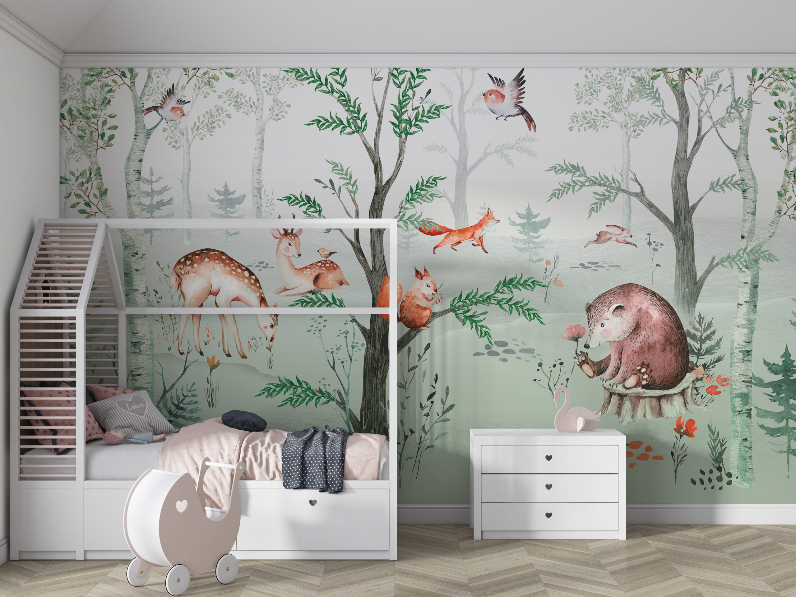 - Zwierzęta leśne przedstawione na fototapecie, takie jak jelenie, lisy, niedźwiedzie czy ptaki, dodają pomieszczeniu charakteru i uroku.