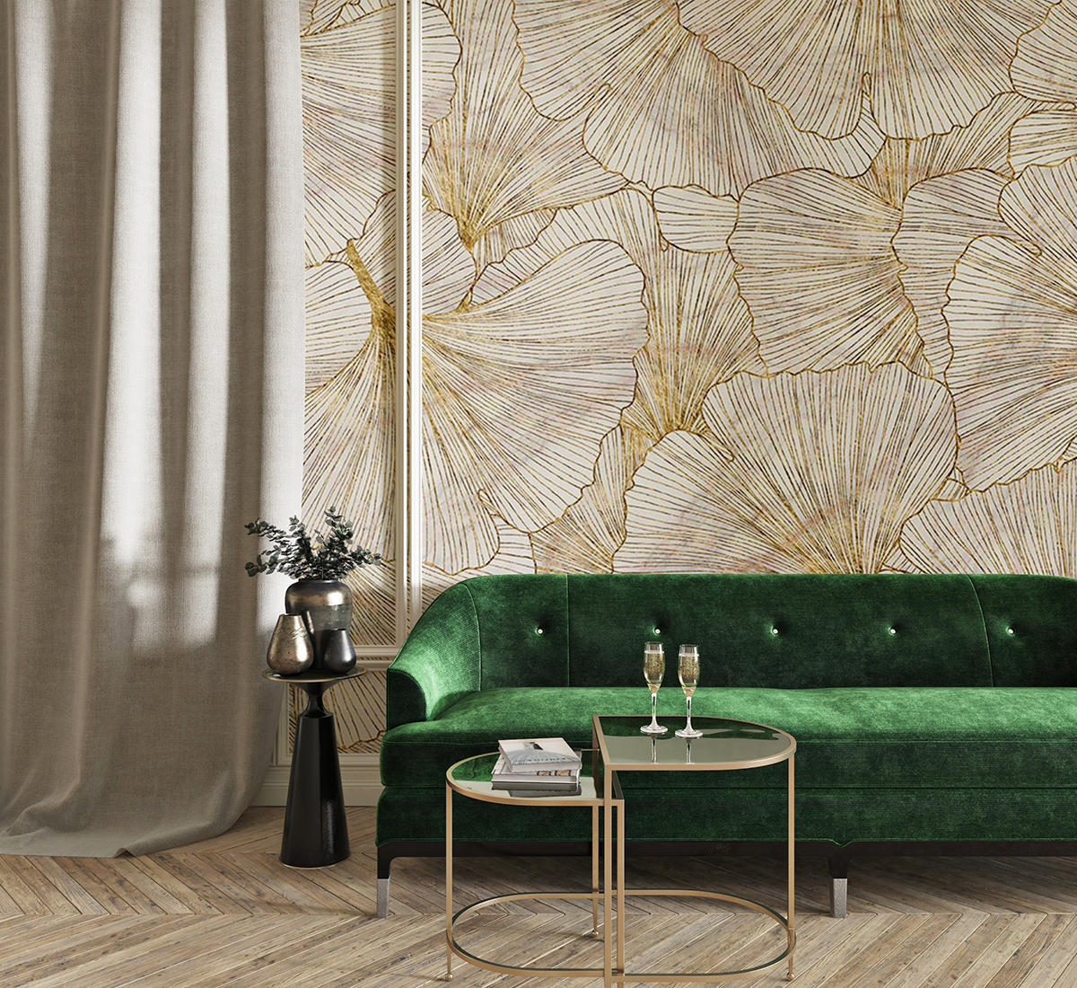 Eine moderne Fototapete mit großen, stilisierten Ginkgoblättern, die in eleganten Gold- und Beigetönen dargestellt sind. Die Blätter haben zarte geometrische Linien, die einen dreidimensionalen, strukturierten Effekt erzeugen und dem Interieur ein luxuriöses und zugleich natürliches Gefühl verleihen.