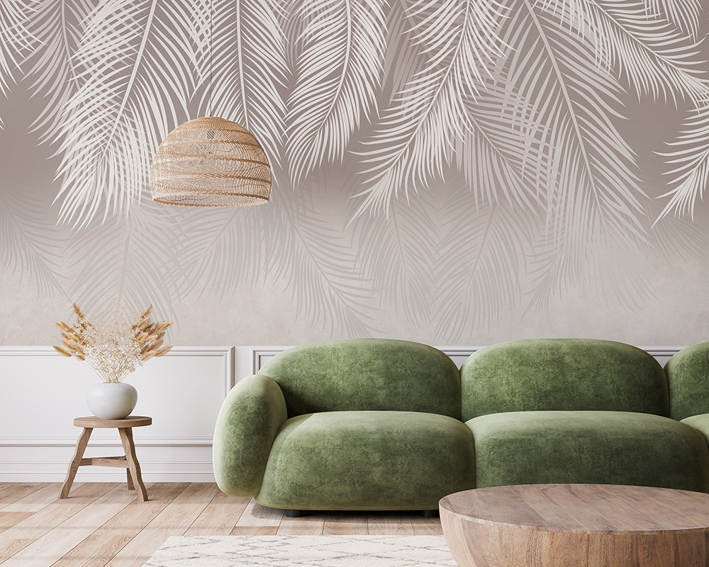 Bringen Sie einen Hauch von Exotik und subtiler Eleganz in Ihr Interieur mit der Fototapete Hanging Leaves. Das zarte, beigefarbene Muster aus Palmenblättern schafft eine entspannte Atmosphäre und passt perfekt zu modernen, skandinavischen und Boho-Einrichtungen. Ideal für Ihr Wohnzimmer, Schlafzimmer oder Büro.