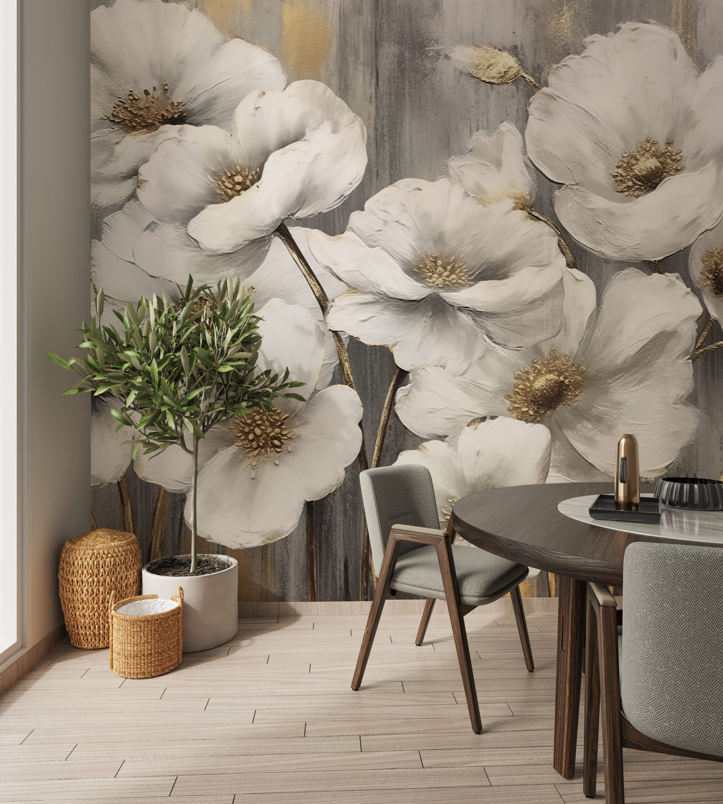 Tauchen Sie ein in die sanfte Atmosphäre, die dieses Wandbild mit blühenden weißen Mohnblumen vor einem Hintergrund aus dezenten Grau- und Goldtönen schafft. Dieses botanische Muster wird Harmonie und Ruhe in Ihr Interieur bringen. Ideal für das Wohn-, Schlaf- oder Esszimmer, wo es Eleganz und natürlichen Charme versprüht.