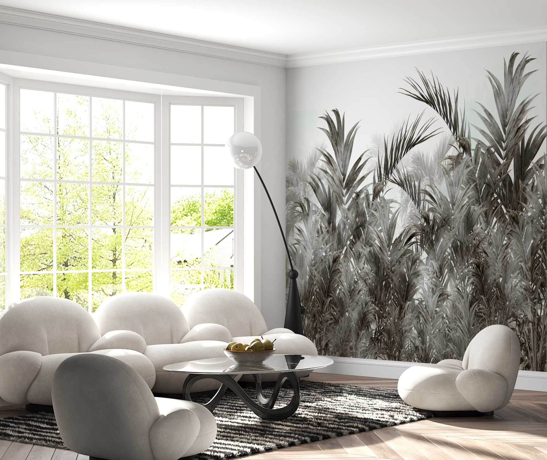 Atogrąžų motyvai – puikus būdas sukurti egzotišką atmosferą bet kuriame kambaryje. Sienų freska „Tropikai be spalvų” – puikus sprendimas ieškantiems minimalistinio ir modernaus dizaino, kuris į interjerą įneštų egzotikos prieskonį.