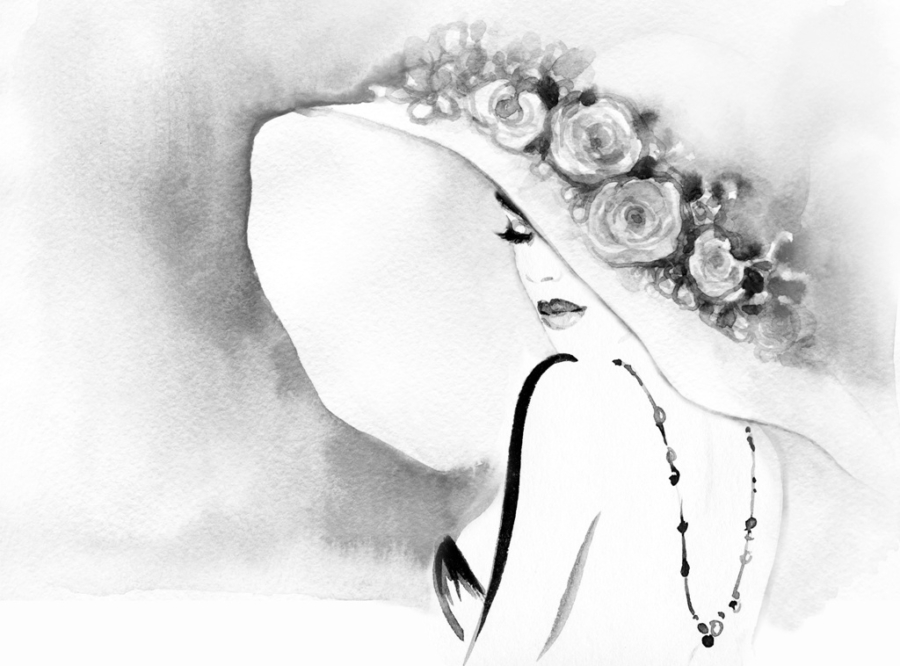 retro stilius. Jame pavaizduota jauna moteris su didele skrybėle, apsigaubusi gėlėmis.