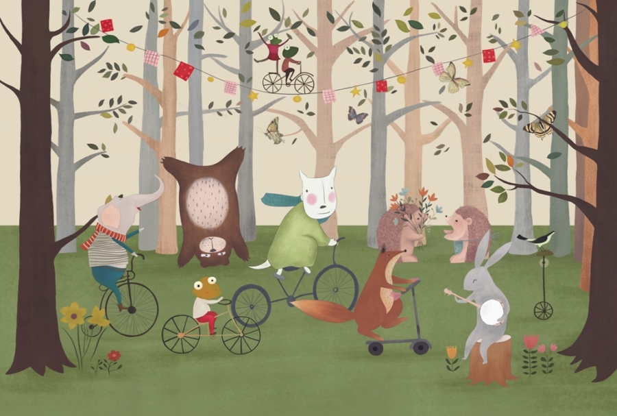 Ši žavinga sienų tapyba – puikus pasirinkimas visiems gyvūnų ir dviračių mylėtojams. Šiame rašte vaizduojami žaismingi gyvūnai, važinėjantys spalvingais dviračiais, todėl visa aplinka atrodo labai juokinga ir žavinga.