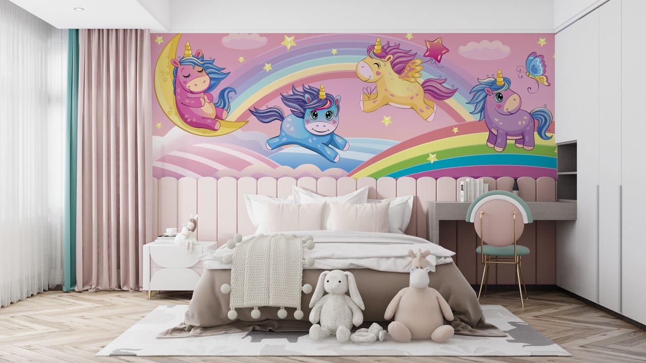 Eine Fototapete mit Einhörnern ist der perfekte Weg, um eine märchenhafte Atmosphäre in einem Kinderzimmer zu schaffen.