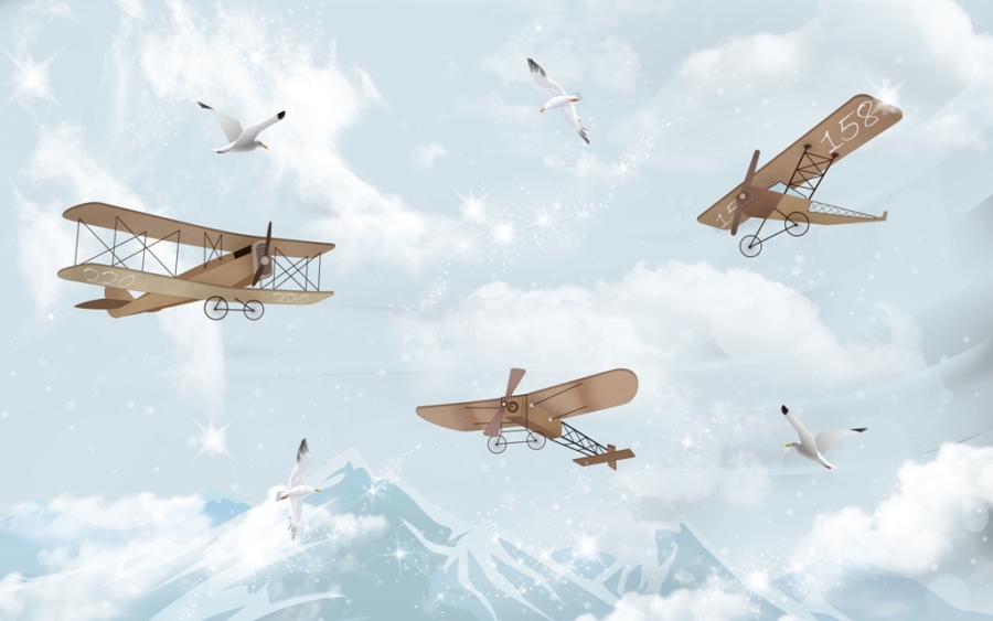 Visezi să călătorești în necunoscut, să zbori pe cerul albastru pe aripile unui avion? Această pictură murală vă va transporta într-o lume magică a aventurilor aviatice, în care avioanele se pierd printre pescărușii albi care plutesc în vânt.
