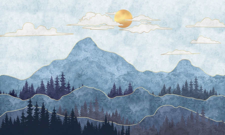Această frumoasă pictură murală înfățișează pitorești munți albaștri cu fire aurii pe ei. Această combinație neobișnuită de culori conferă interiorului un caracter unic și va face din orice cameră un loc magic și special.