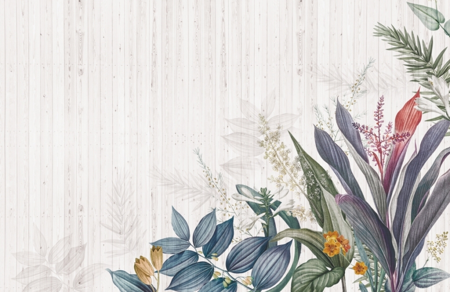 O pictură murală elegantă, stilată, care impresionează prin compoziția sa originală. Buchetul, format din frunze și ierburi, a fost plasat pe un fundal subtil care poate aduce aminte de planșe. Plantele în culori vii sunt juxtapuse pe un fundal ușor, delicat, creând o combinație încântătoare. Pictura murală a fost concepută astfel încât să nu copleșească interiorul în care va fi amplasată. Este într-adevăr o alegere excelentă dacă doriți să terminați un perete într-un mod original. Acesta poate fi utilizat în orice parte a casei, în funcție de nevoile și preferințele individuale.