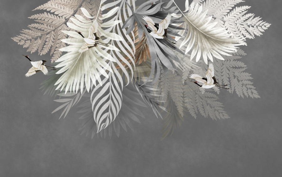Această pictură murală fermecătoare prezintă un model de păsări albe printre frunze de palmier verzi. Este ideală ca decor de perete în camera de zi, dormitor sau camera copiilor, conferind camerei o atmosferă exotică și plăcută.