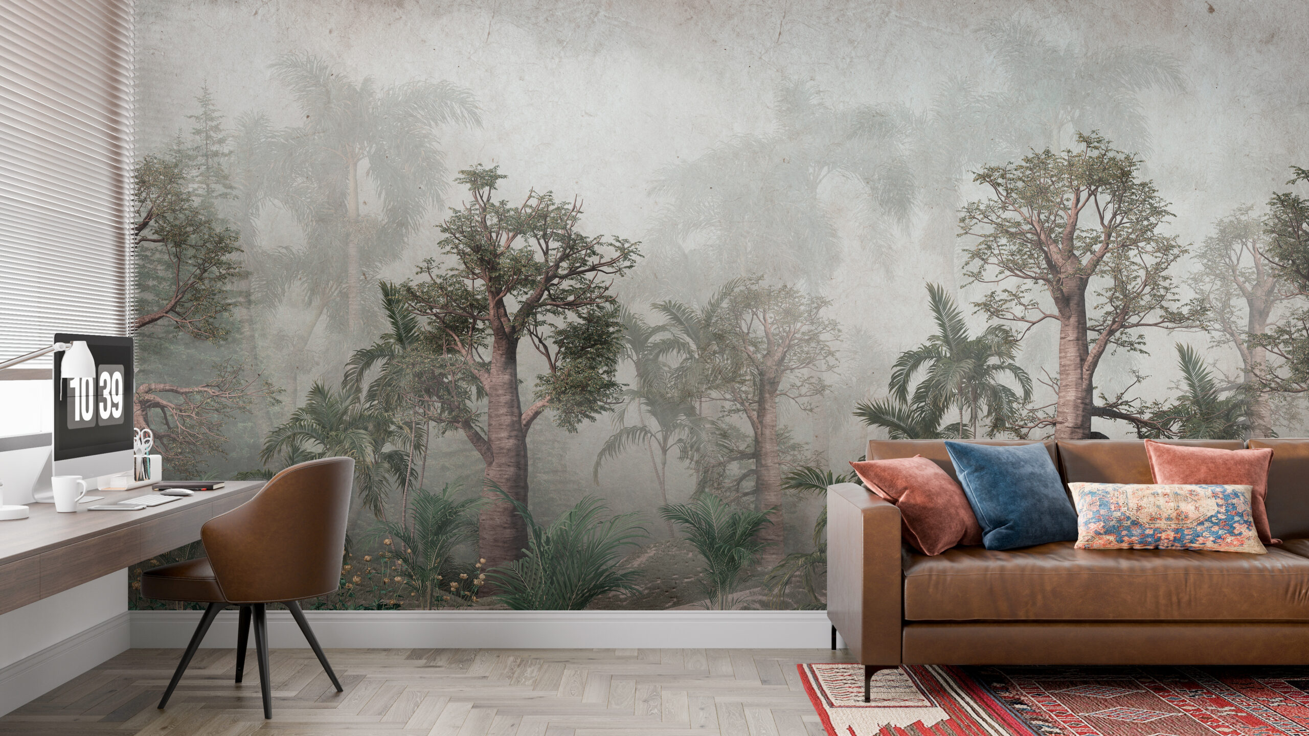 Această pictură murală fermecătoare înfățișează o pădure magică de sequoia dimineața, când ceața înconjoară copacii măreți, creând o atmosferă stranie de mister și liniște. Cu acest model, interiorul dvs. va căpăta un caracter unic și va deveni o oază de calm în agitația vieții de zi cu zi.