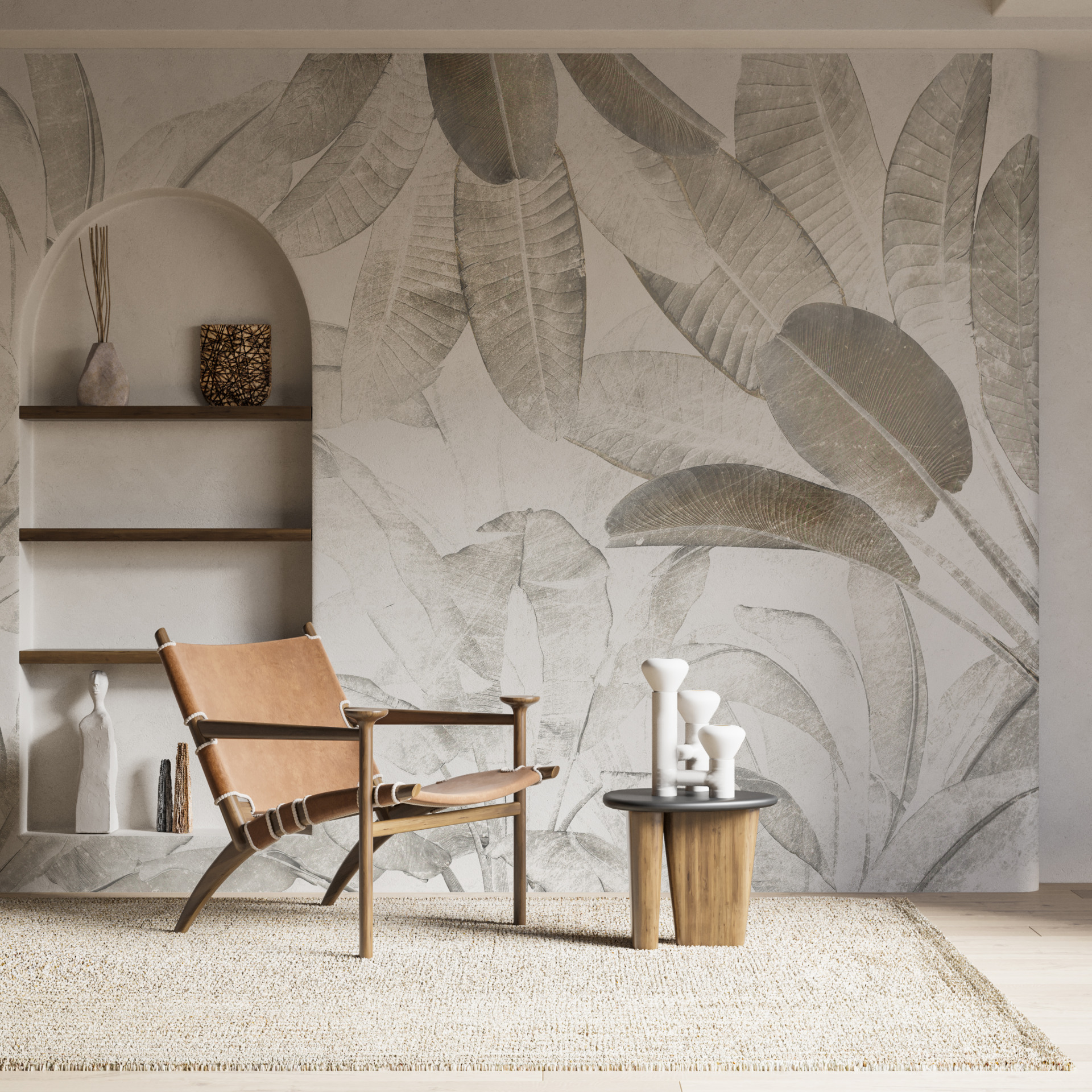 Transportă-te într-o pădure magică, plină de plante misterioase și colțuri ascunse, cu această pictură murală fermecătoare de perete cu frunze mari în spatele ceții. Datorită aspectului său realist, vă veți simți ca și cum v-ați fi mutat într-o altă lume în care natura este la îndemâna dumneavoastră. Frunzele plantelor, acoperite de o ceață fină, creează o atmosferă extraordinară de pace și armonie, care va face ca fiecare zi să fie specială.