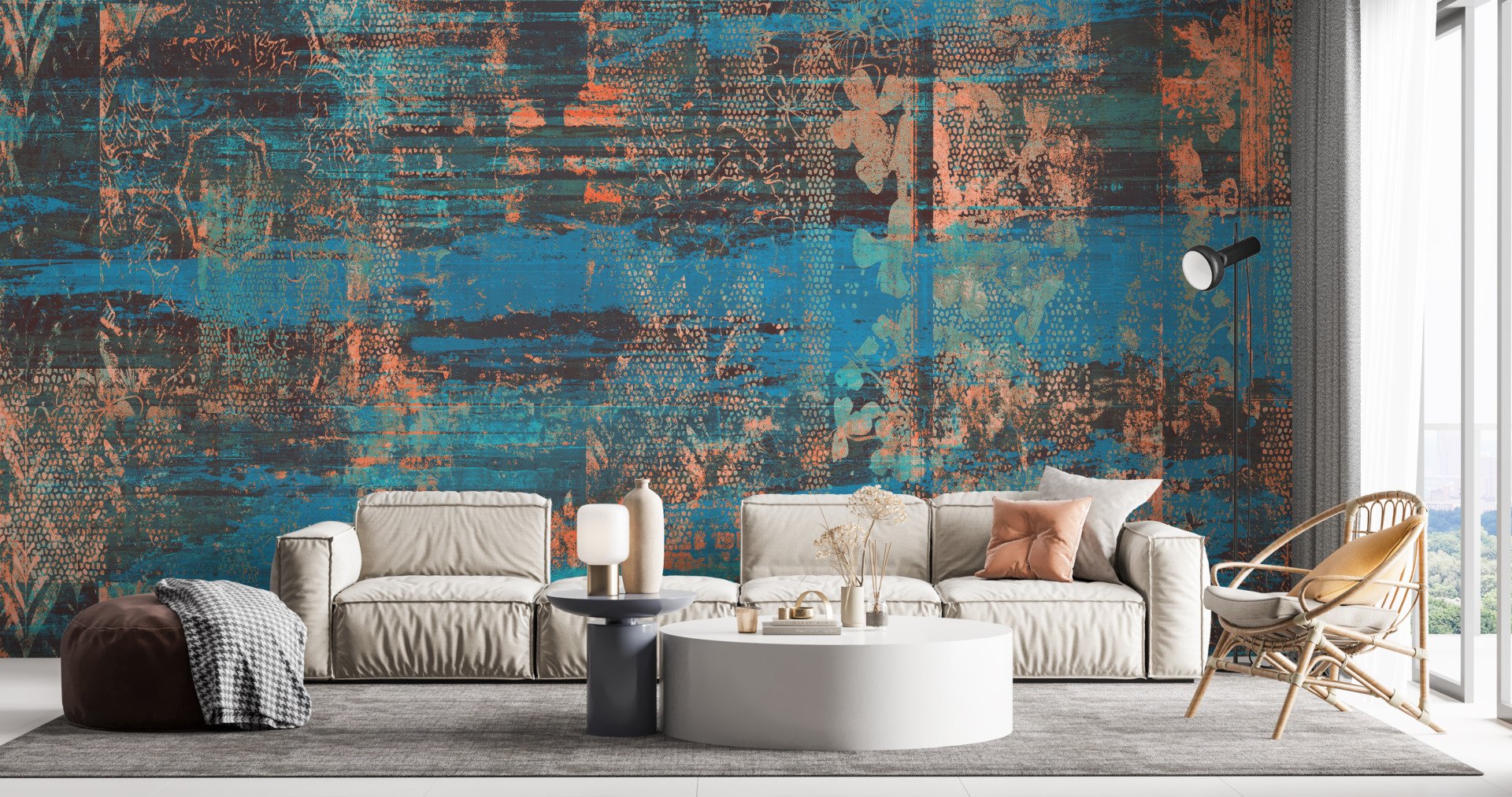 Denna ovanliga väggmålning visar känsliga fotspår på en blå bakgrund som gör alla rum unika. Med sina subtila färger och abstrakta motiv skapar du en unik atmosfär i din inredning.