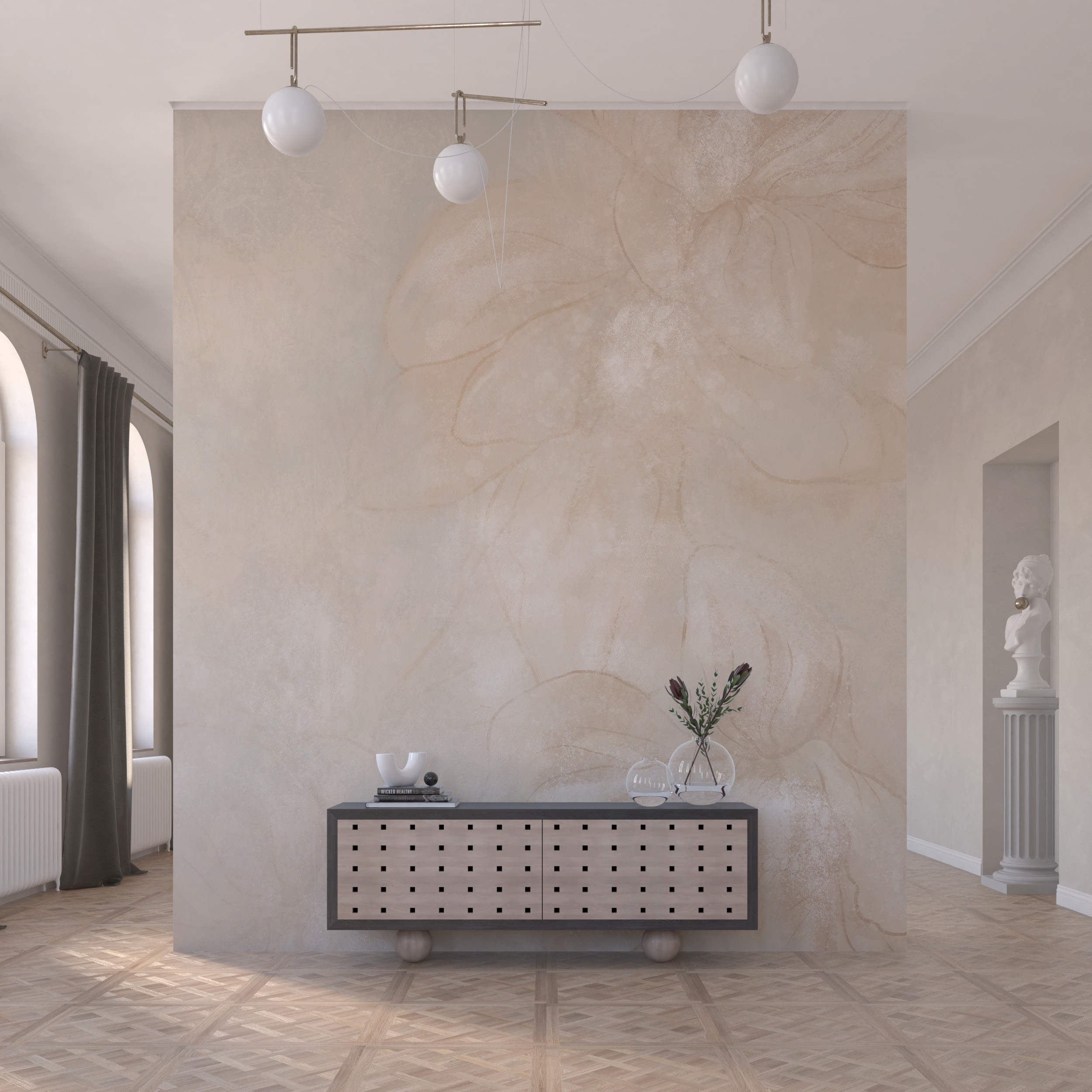 Na první pohled se může zdát, že na této nástěnné malbě není žádná květina. Při bližším pohledu si však všimnete jemných linií a tvarů, které vytvářejí jemný obraz květiny skrytý v abstraktním vzoru.