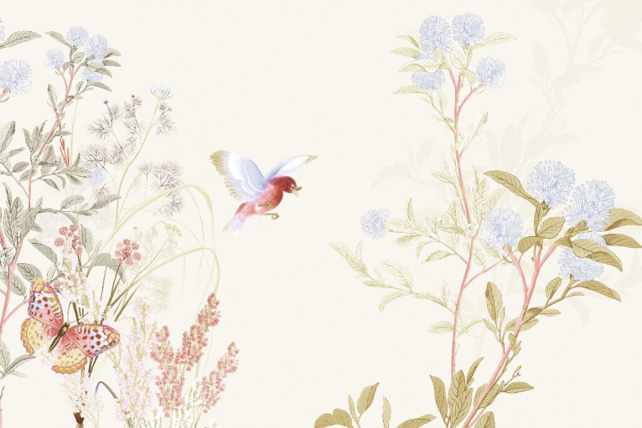 Nástěnná malba Pták a motýl mezi květinami