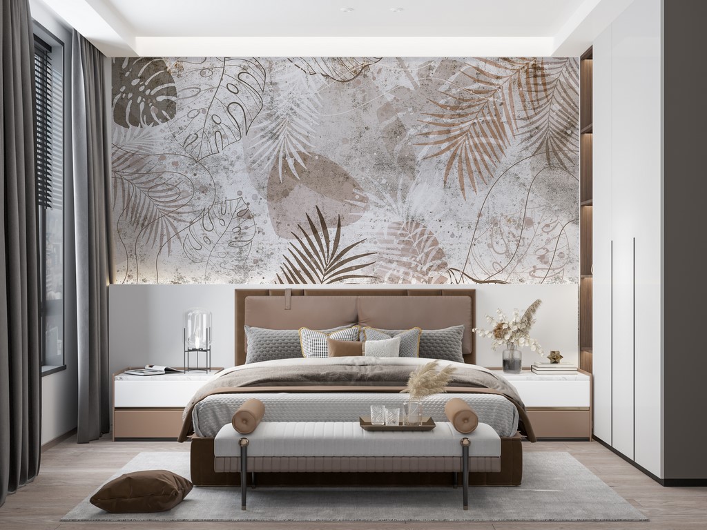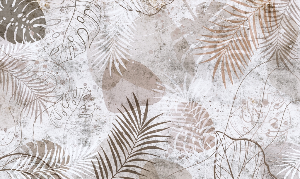 Jedinečná nástěnná malba, která zaujme kombinací tropických listů s tlumenými, jemnými barvami. Zkušené oko si všimne palmových listů a také listů monstery, které jsou již nějakou dobu velmi módní. Různé odstíny šedé a béžové dodávají eleganci a