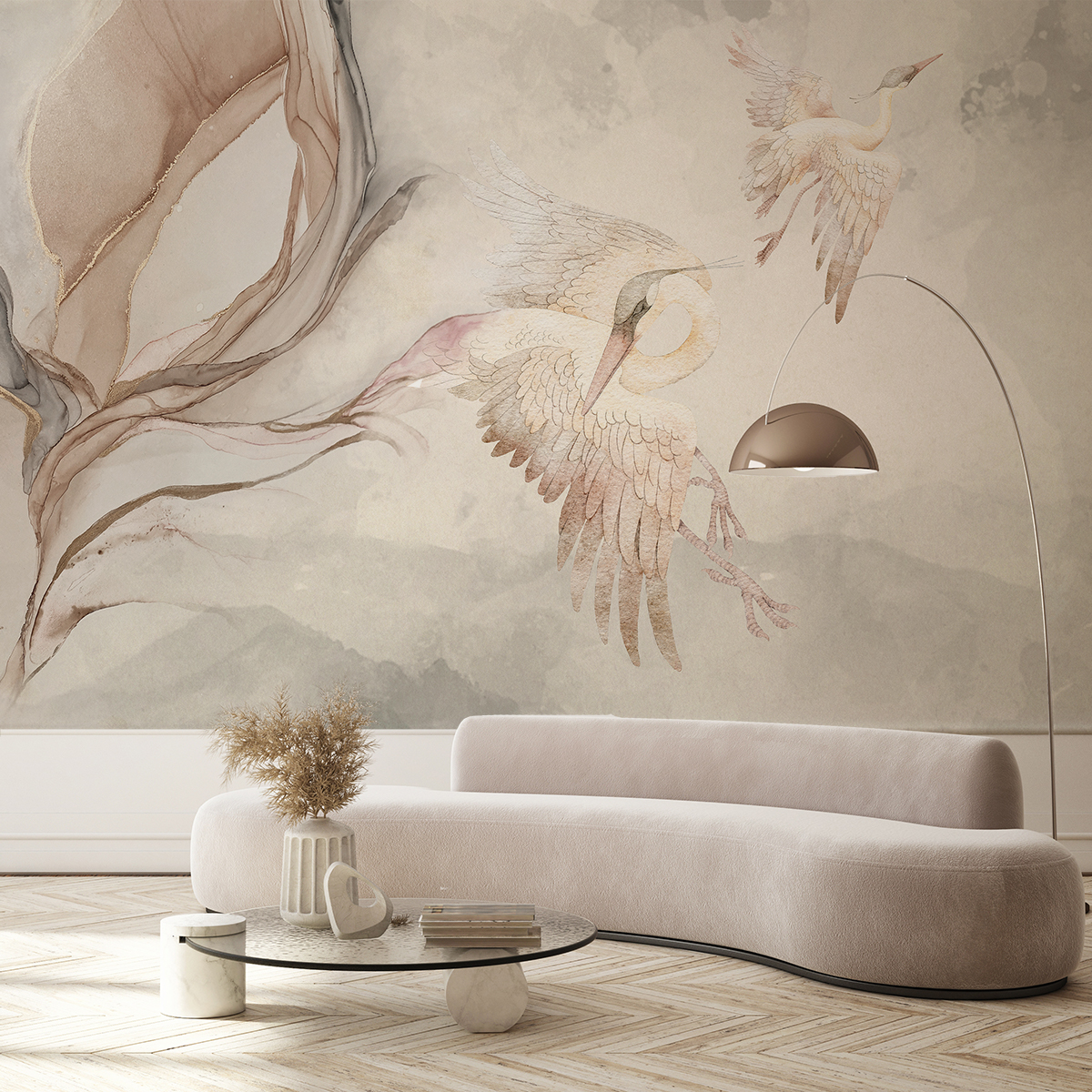 Mural „Păsări romantice” – luminozitate subtilă, eleganță picturală și farmecul liniștitor al naturii