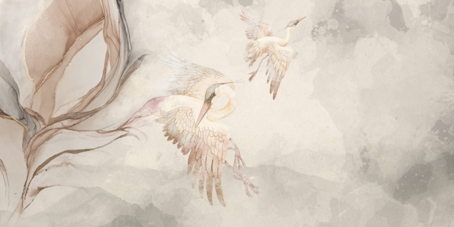 Aduceți o atmosferă de liniște și frumusețe poetică în interiorul dvs. cu tapetul foto „Romantic Birds”. Această compoziție delicată de acuarelă cu păsări plutind în aer emană lejeritate și armonie. Nuanțele subtile de bej, roz și gri creează un fundal liniștit, aproape eteric, care funcționează perfect cu liniile elegante, organice.